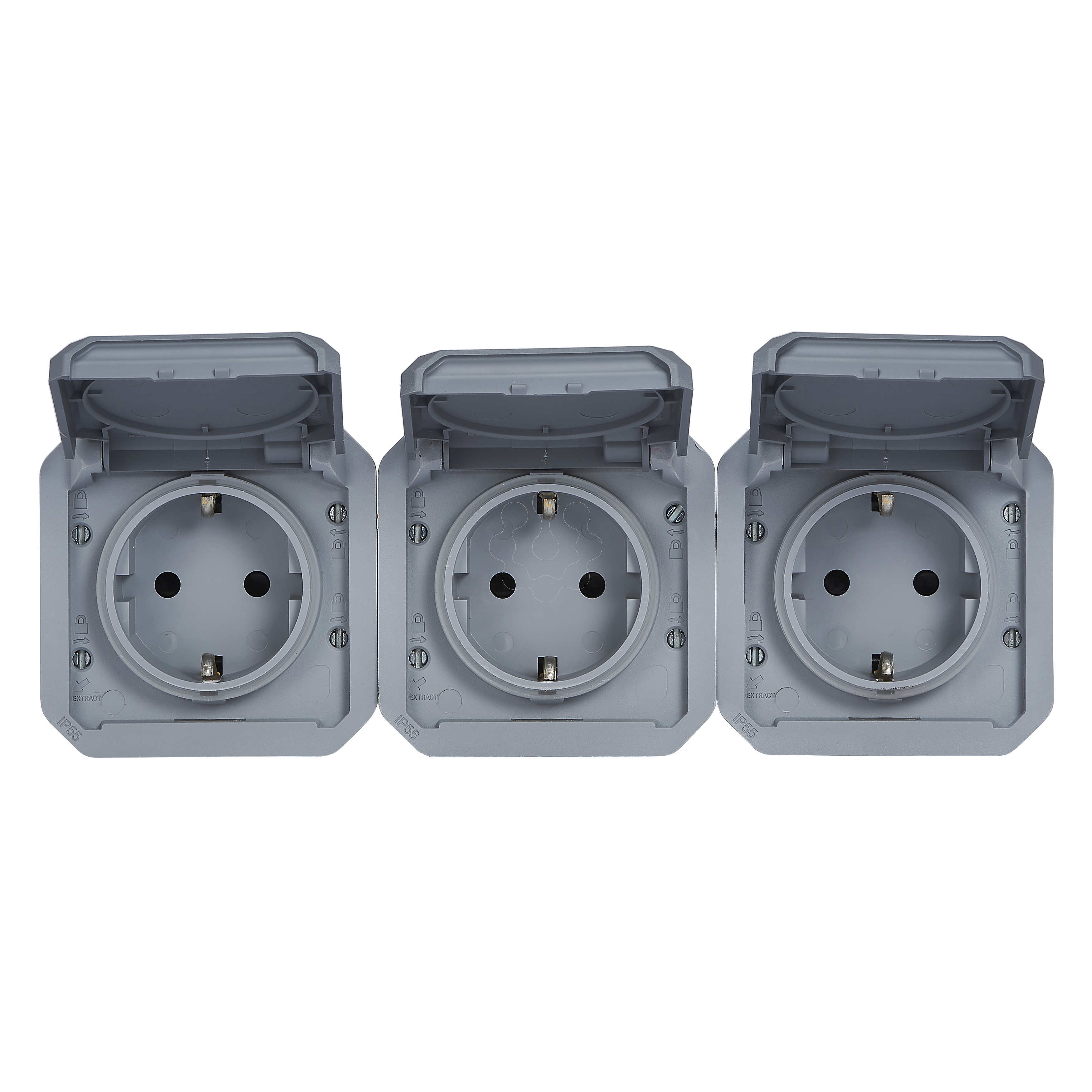 Plexo IP 55 componível - 3 x 2P+T Schuko, pré-cablada, Horizontal, Cinzento