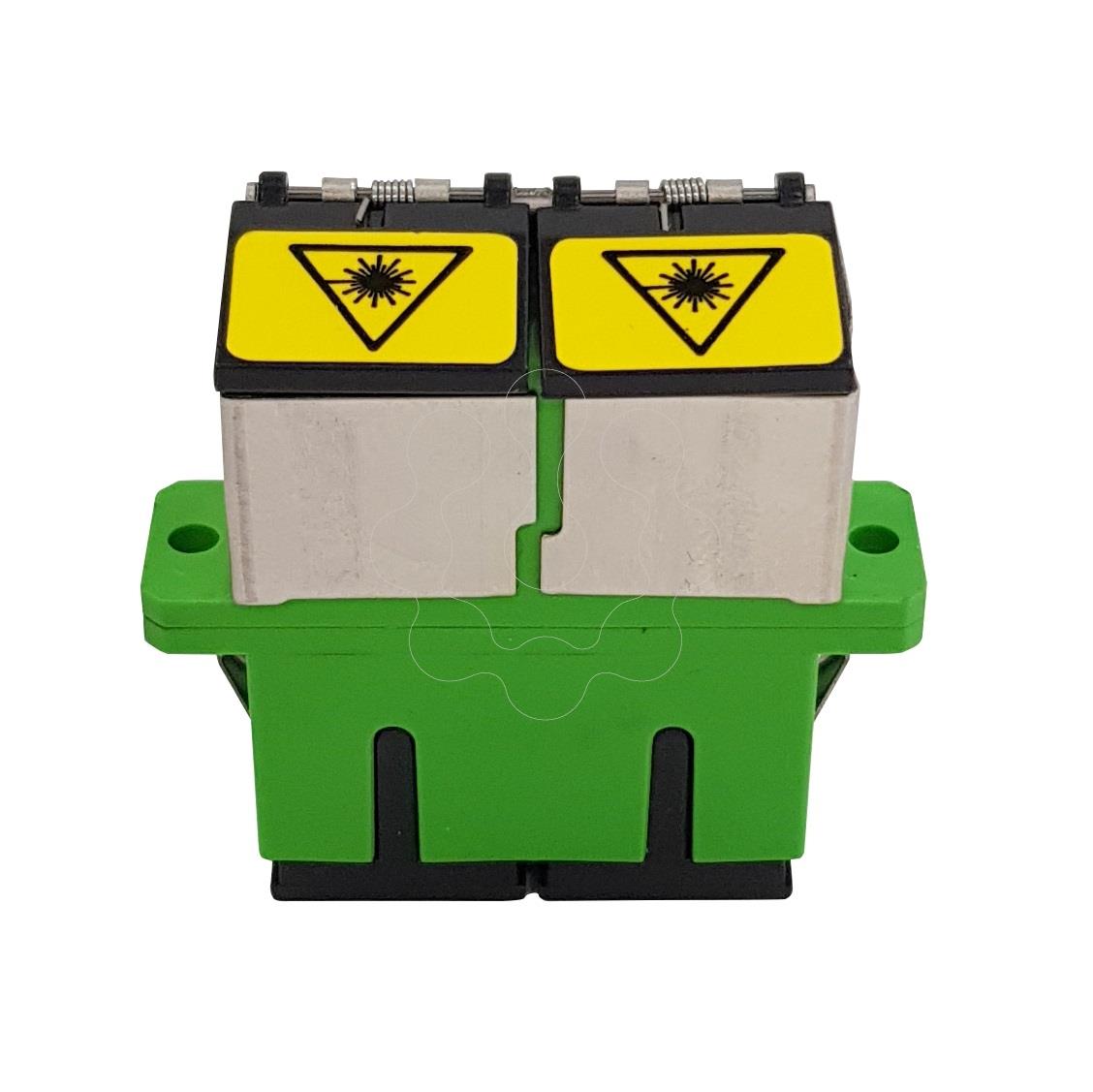 Adaptador SC/APC Fêmea – SC/APC Fêmea Duplex Monomodo, com Tampa de Autobloqueio. Adaptador SC/APC Fêmea – SC/APC Fêmea Duplex Monomodo, com Tampa de Autobloqueio. Adaptador que permite conectar entre si conectores ópticos machos, com mecânica SC e polido APC, em ambas as extremidades. Compatível com fibras monomodo (SM) . Baixas perdas de inserção e alta confiabilidade . Permite sua instalação por meio de um ''clipe'' (incorporado), ou parafusos de fixação (não incorporados). Evita contatos falsos, bem como desconexões ocasionais.